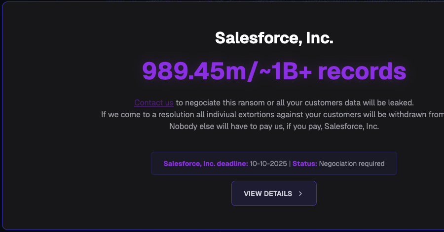 Nhóm tin tặc tuyên bố đã chiếm được gần 1 tỷ bản ghi dữ liệu và đe dọa sẽ công khai toàn bộ nếu không nhận được tiền chuộc – dù từ từng công ty riêng lẻ hay một khoản thanh toán chung từ Salesforce.
